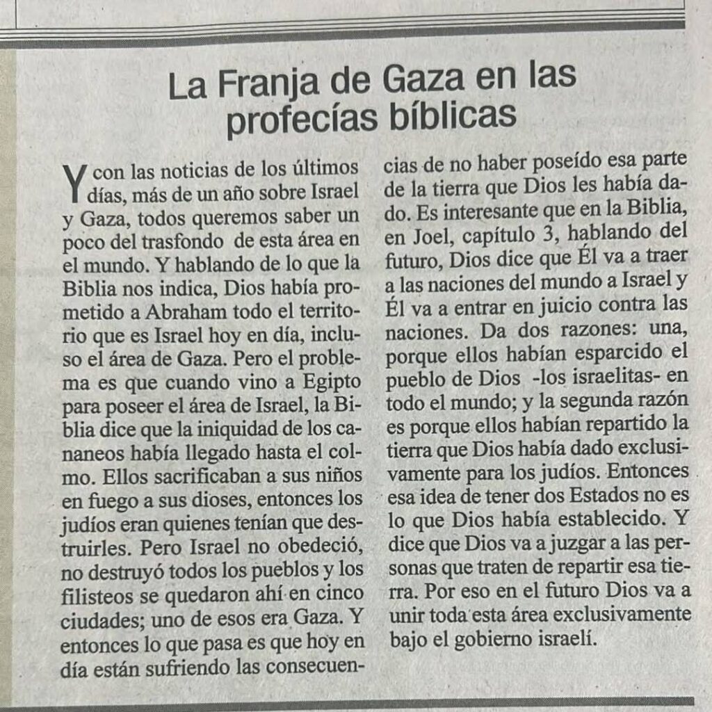 El recorte periodístico que acompaña este artículo a manera de ejemplo de posturas sionistas cristianas, titulado “La Franja de Gaza en las profecías bíblicas”, afirma que las promesas hechas a Abraham abarcan la Franja de Gaza, atribuye el presente sufrimiento palestino a la no posesión total de la tierra por parte de Israel y apela a pasajes como Joel para sostener que Dios juzgará a las naciones que repartieron la tierra y que, en el futuro, reunirá esa región bajo gobierno israelí.